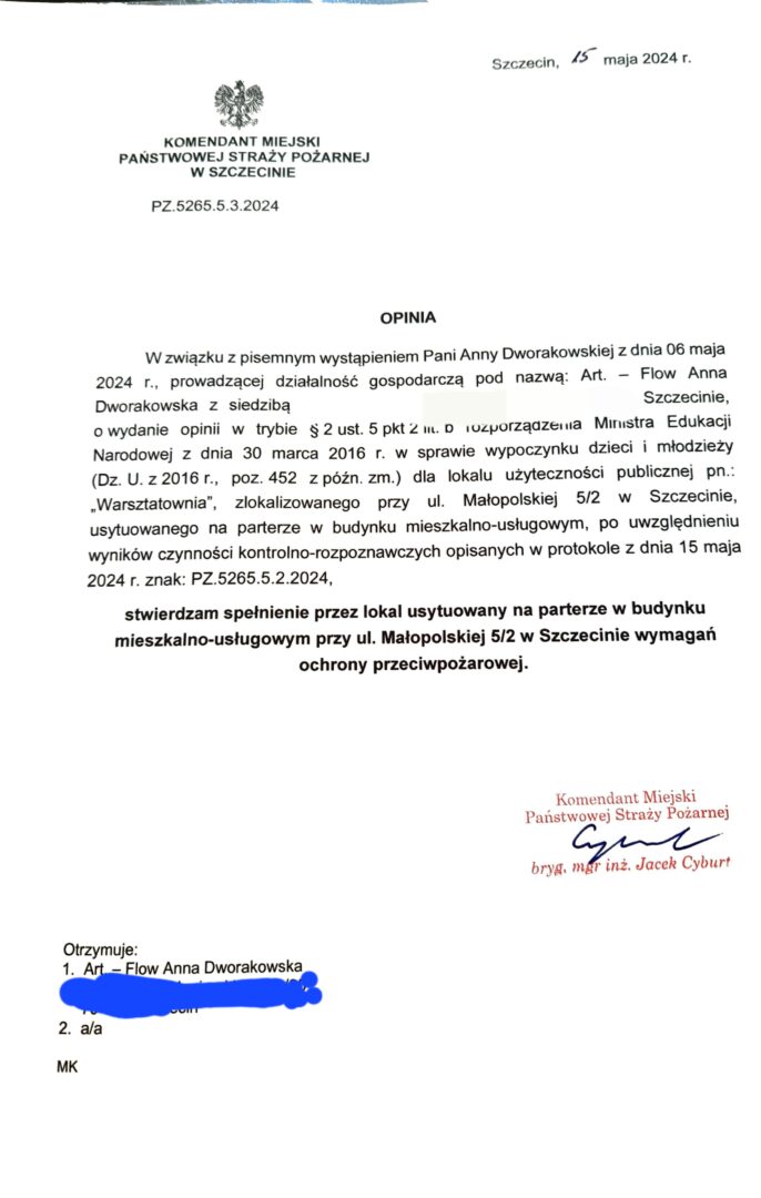 • Posiadamy pozytywną opinię Komendanta Straży Pożarnej dotyczącą spełnienia wymagań bezpieczeństwa lokalu oraz lokal przygotowany przez profesjonalną firmę BHP
